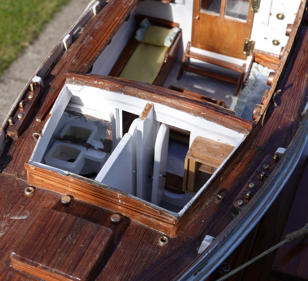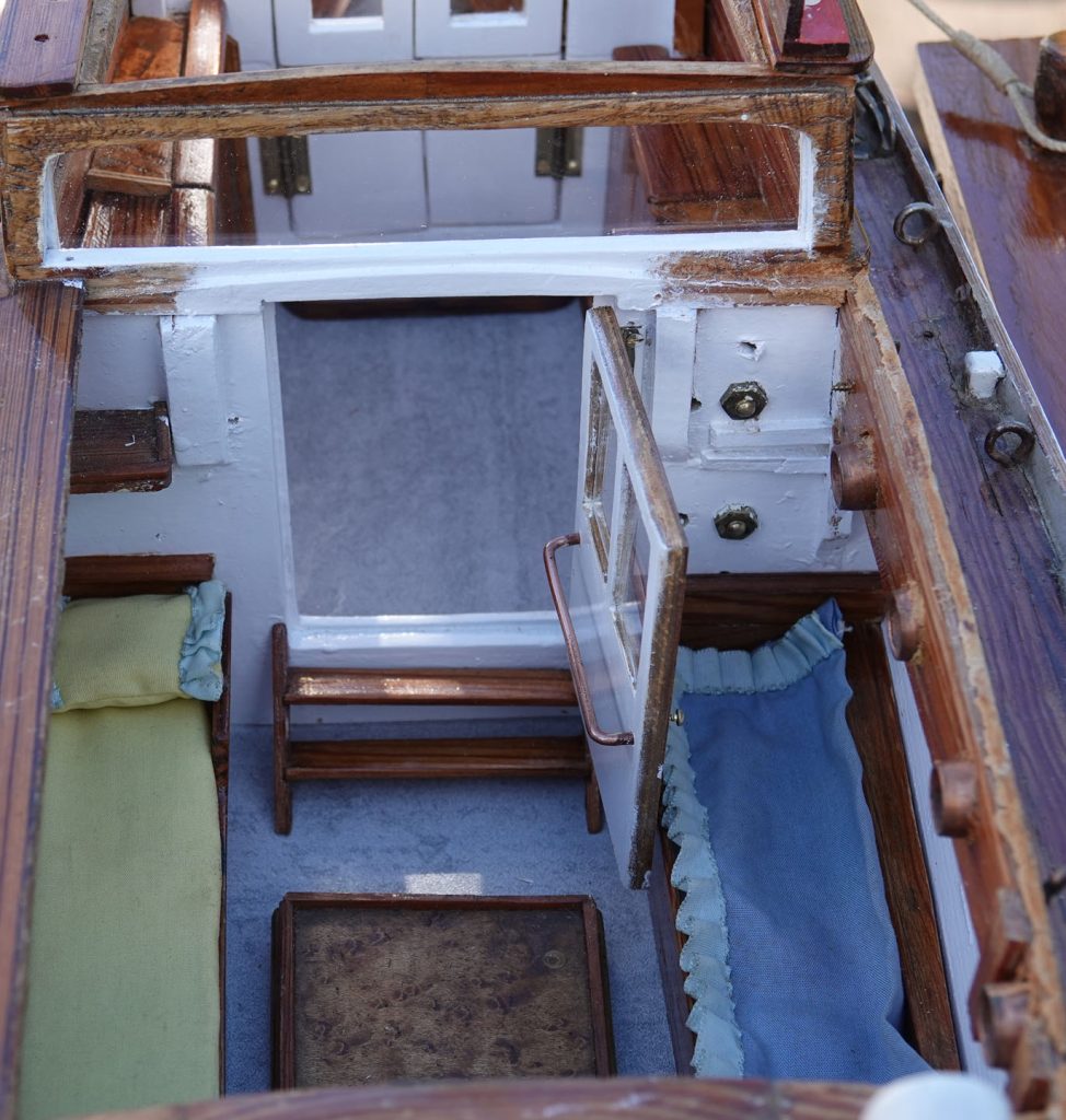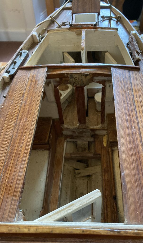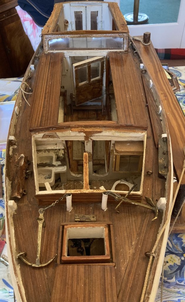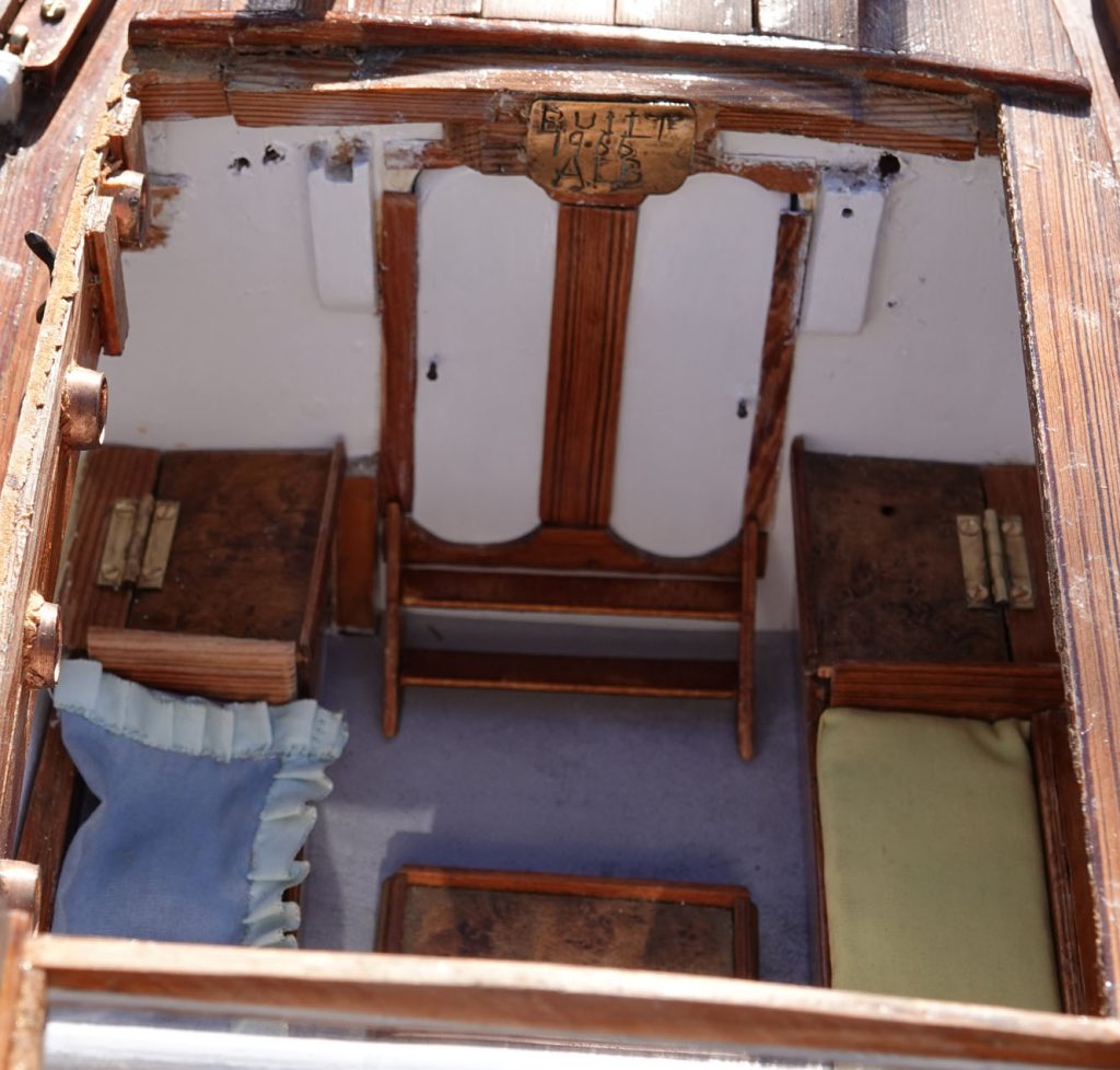 The model had a good level of interior detail which included lights. When newly finished it would have looked impressive. The majority of the fittings on the deck & rigging had been scratch built by the builder. To some extent the interior was spoilt by the motor and the necessity for (in those days) a bulky battery placed in the main cabin.
